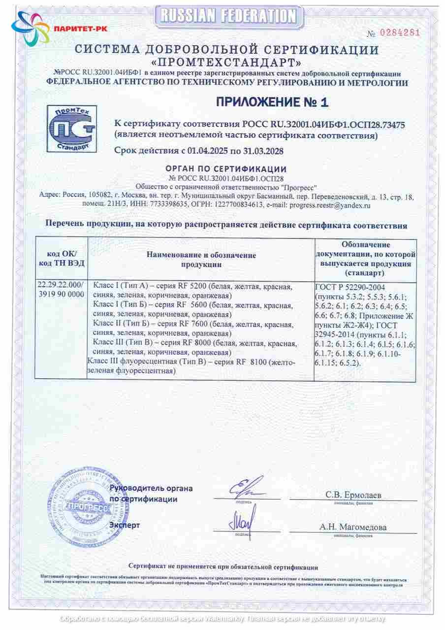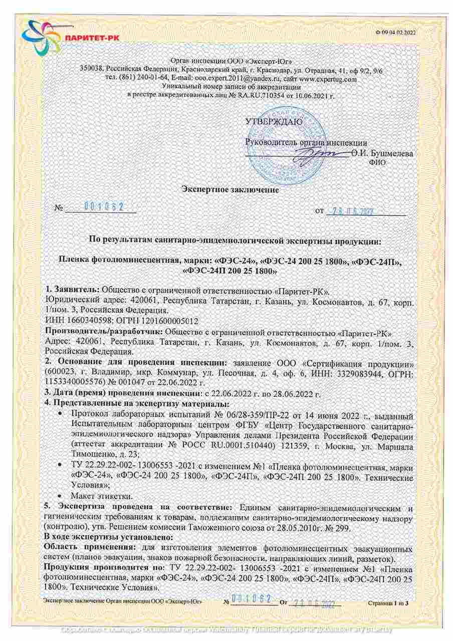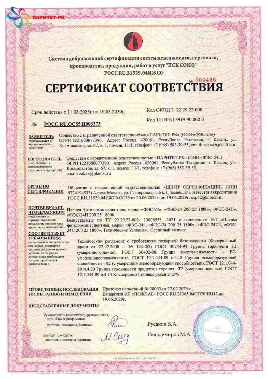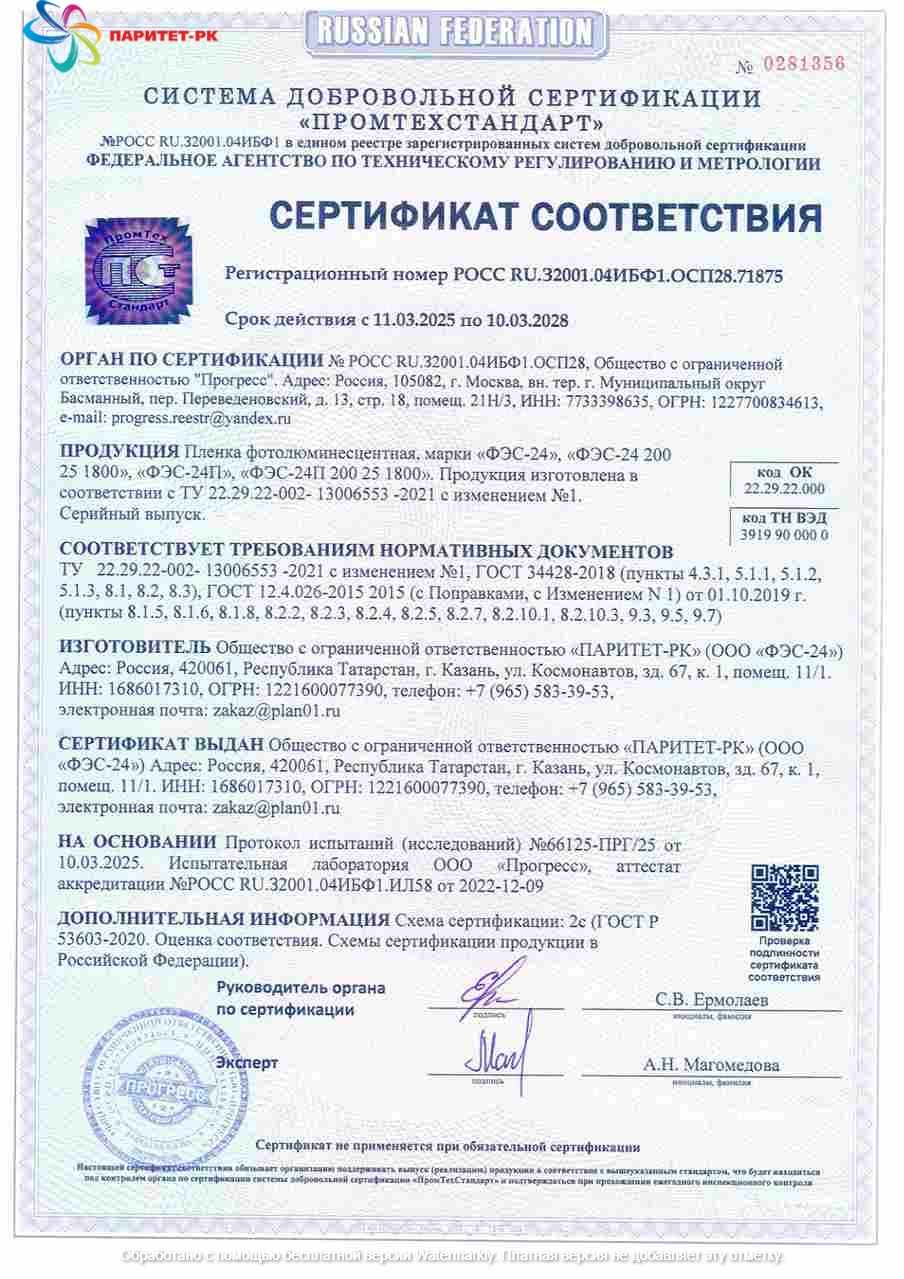 ООО «Паритет-РК» с 2012 года является одним из наиболее признанных в России производителей фотолюминесцентных плёнок. Наша компания строго соблюдает требования ГОСТ 12.4.026-2015 (с правками от 01.10.2019 г.) и ГОСТ 34428-2018, подтверждая качество соответствующими сертификатами.