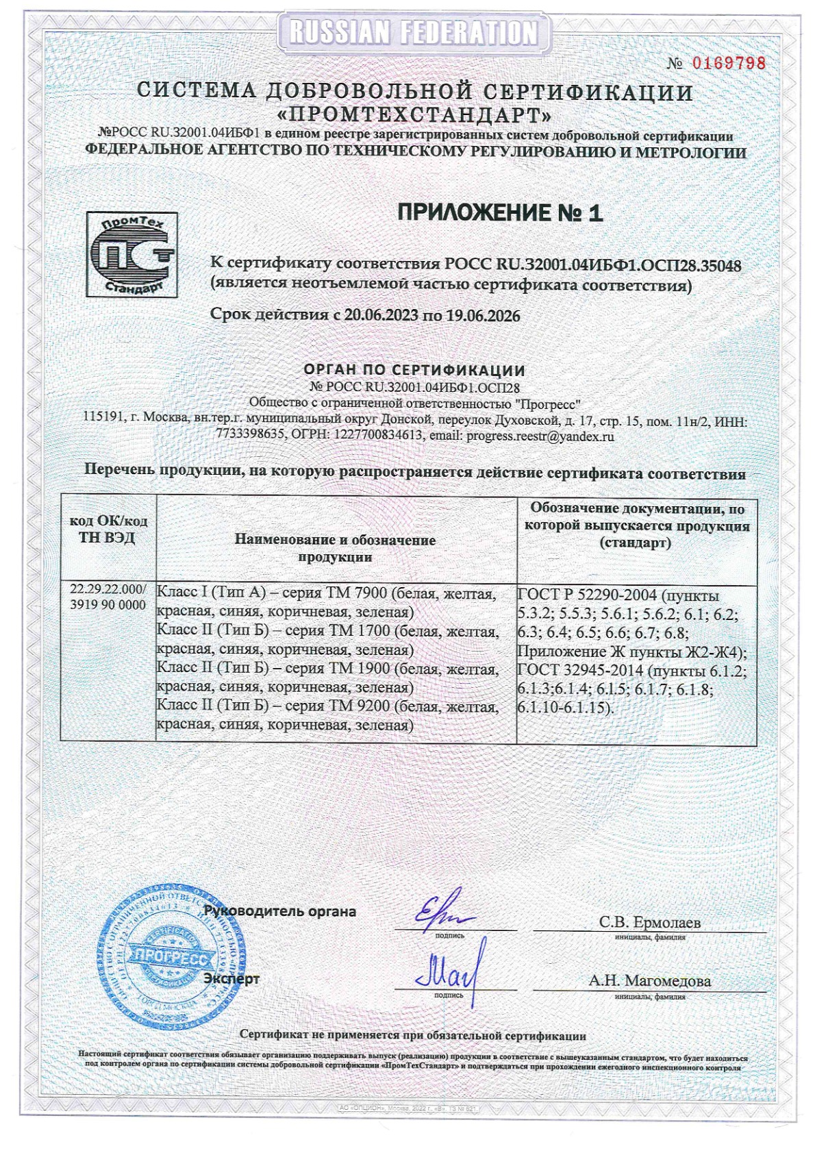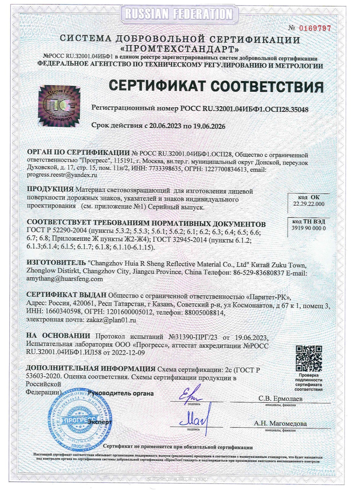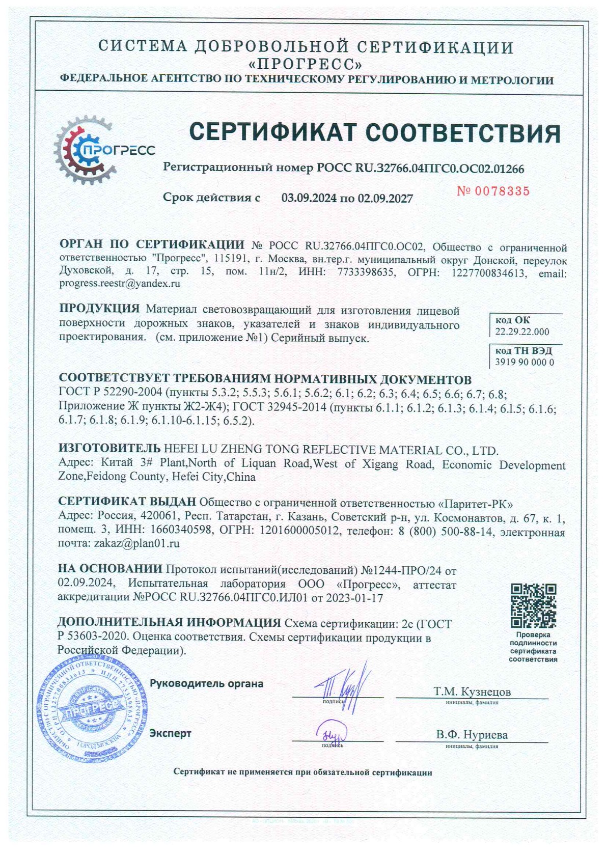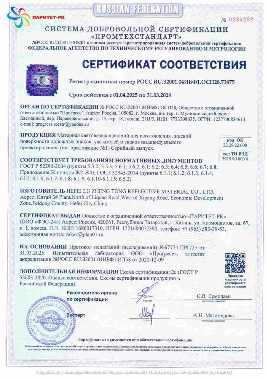 ООО «Паритет-РК» с 2012 года является одним из наиболее признанных в России производителей фотолюминесцентных плёнок. Наша компания строго соблюдает требования ГОСТ 12.4.026-2015 (с правками от 01.10.2019 г.) и ГОСТ 34428-2018, подтверждая качество соответствующими сертификатами.